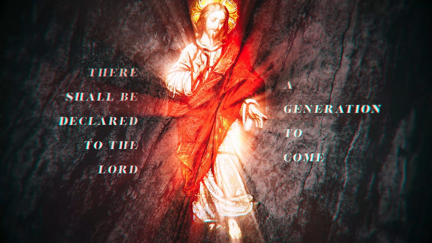 The Psalmist now proclaims the declaration or announcement (annuntiabitur) of Christ’s victory. This victory is begun on the cross and manifested in the Resurrection, but is completed or consummated now in the drawing of the nations into His mystical Body. The Psalmist speaks of this as the generation to come, and then expands upon it in the parallelism with a people that shall be born. Both of these expressions combine to demonstrate that the Psalmist is not looking forward to a natural generation or people, but rather one that would be—as St. John says—born, not of blood, nor of the will of the flesh, nor of the will of man, but of God. At the time of the Psalmist the nations of the Gentiles were outside of the covenant, but now in Christ the have been brought into union with Him: