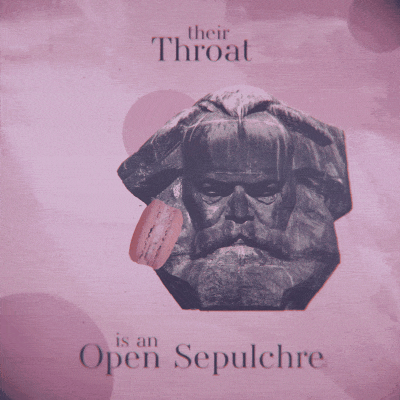 This animation was entirely premised on the image I found. I knew I wanted a head eating stuff, but I found this striking (not in a good way) image of a statue of Marx and thought it would be a perfect metaphor for a throat being an open sepulcher, as perhaps no ideology has unleashed so much misery and destruction as that of its eponymous progenitor.