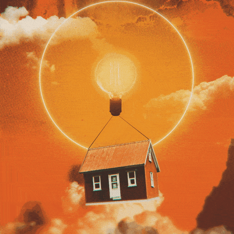 For some reason the notion of a floating house was interesting to me, and then I imagined a house being suspended on a light bulb. I found the various images and composed them together in After Effects and did a little position animation in the light bulb, parenting the house to it and then animating the rotation to give it a bit of visual interest.