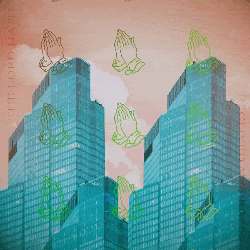 In this animation I wanted to capture the superlative nature of this verse, and so I grabbed this image of praying hands and used Motion Tile to repeat the pattern over and over, while also animating it both vertically and horizontally to capture the nature of praying at all times. I also used loopFlow to animate the clouds in the background. The skyscrapers are there purely because I thought they looked cool.